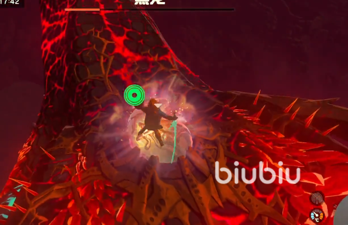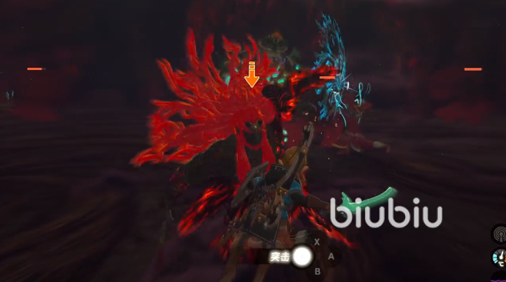 然后我们需要操纵林克,拔出大师之剑进行攻击,注意躲避魔王挥出的剑刃,小林克吃不消的。我们可以一边躲避,一边迎敌,会触发突击的效果,按住Y键,可以打出多段伤害。之后boss会和我们拉开身位,我们趁机掏出弓箭,选择组合混乱花,这样可以远程消耗,并且造成boss陷入短时间的混乱,不能移动的状态。