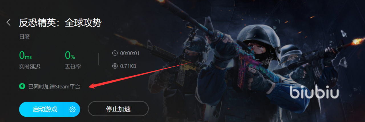 我们以这款CS:GO游戏为例,直接进行加速,会看到当前biubiu加速器对网络环境的优化效果,而且支持即开即停,在我们结束游戏之后,要停止加速。这样一方面,降低网络负荷,另一方面,我们在运行其他软件的时候,可以腾出更多网络传输数据为其服务。目前,该款加速器对steam平台和steam支持的国服游戏都有免费加速服务。而且如果大家是新用户的话,还会立即获赠三天的加速会员。对于新用户来说,还有首充优惠。
