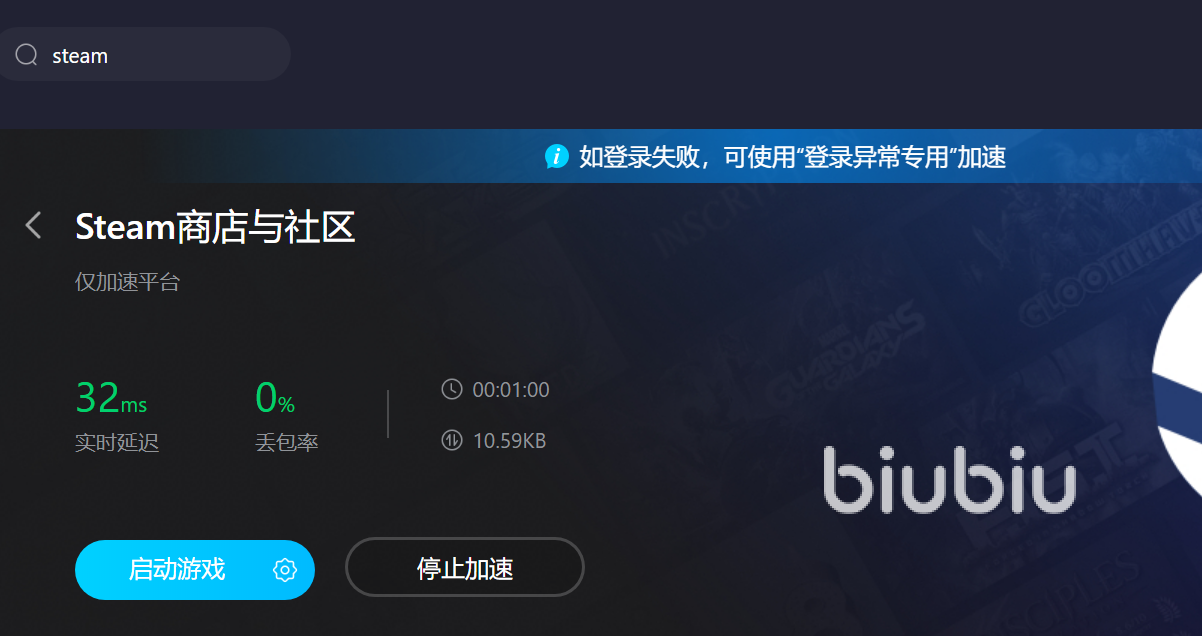 以商店与社区加速为示例我们在加速的时候可以随时观看biubiu运行的状态,对网络的优化情况等信息。在对steam加速的过程中,可以将网速提高而且波动更小。并且可以随时暂停加速服务。并且对于登录失败的问题biubiu还给出了解决方法,大家遇到这一问题,使用登录异常专用的加速器渠道进行提速。我们直接在biubiu上可以直接打开steam登录界面,从而畅享极速登录体验。
