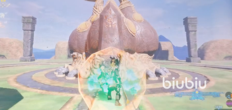 那么话不多说,我们就进入神殿中一探究竟吧。首先进入神殿我们可以看到构造非常的简单,使用滑翔伞一直往前就行,在路上会遇到一个守护者,击败它继续向前,我们可以看到一个勇导石,玩过前作的玩家一定知道这是干什么的。没错,它是用来下载地图的装置,我们将希卡之石放入,就可以使用地图操控风之神殿的方向了。