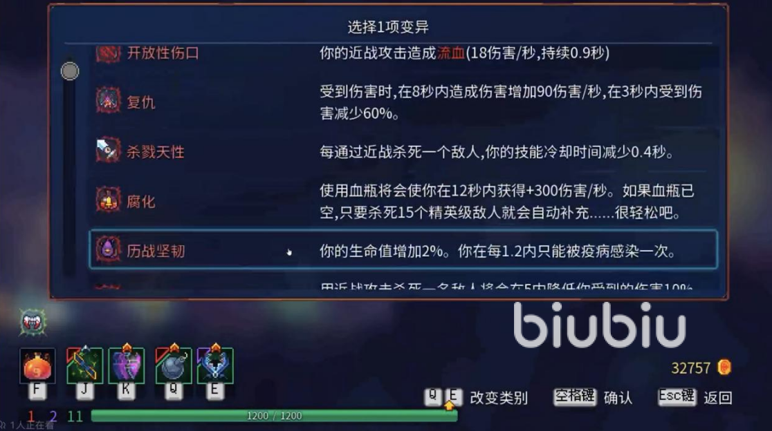 刷完有罪者大道后看一下地图有没有漏掉的符文和图纸没有捡,后面的堡垒和前面的地图一样的流程探地图、拿卷轴尽量不要理怪减少时间。在我们进入黑色大桥后遇到吉米长按R键可以选择一个变异项,你可以根据自身的要求选择合适的类别去加强游戏人物的属性。