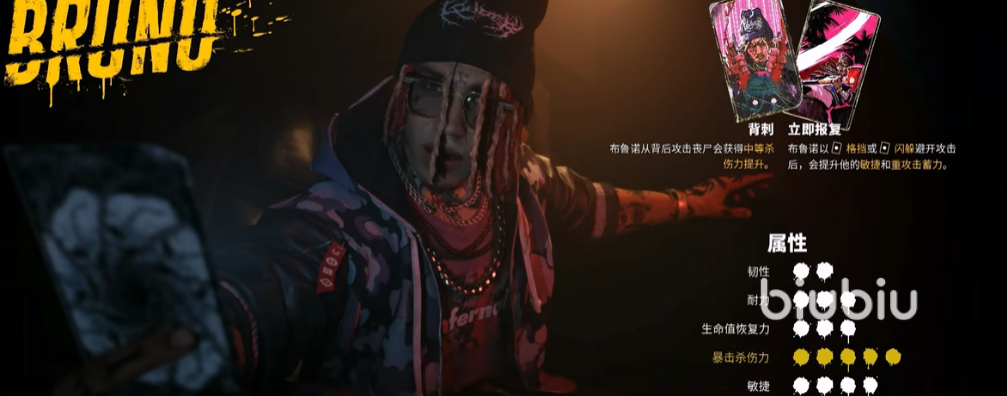 JACOB的技能是凶猛野性(连击可以增加伤害)和危机怪力(在耐力较低时,触发暴击可以恢复耐力并获得中幅度的暴击伤害提升),这意味着他可以像狂战士一样不断地进行攻击;BRUNO的技能是背刺(背击丧尸会获得中幅度的伤害提升)和立即报复(成功格挡或者闪避攻击,会提高敏捷和减少重击的蓄力时间),能力机制使得我们尽可能的利用潜行去攻击;CARLA的能力是冲撞区(在被丧尸包围时获得伤害的提升)和绝境毅力(生命垂危时,会大幅度提升韧性)。