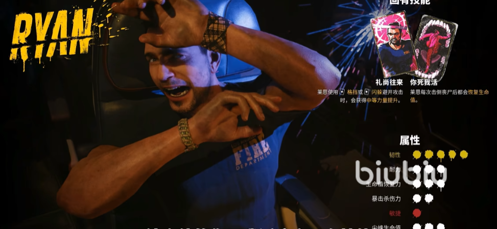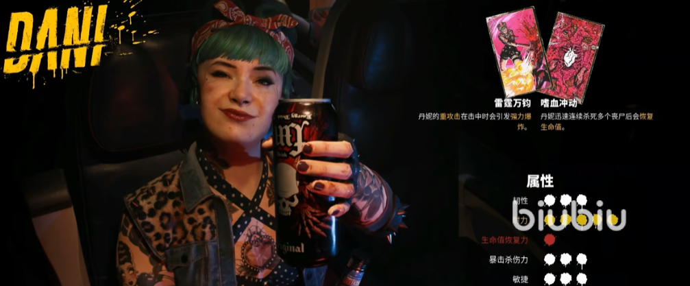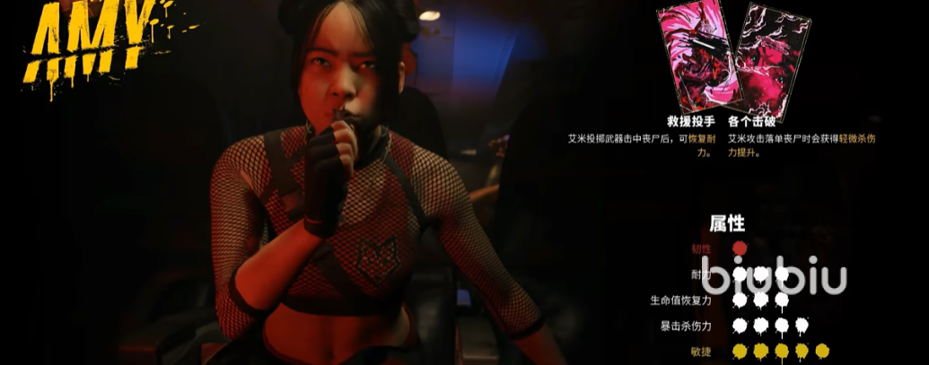 DANI拥有雷霆万钧(蓄力攻击会产生爆炸)和嗜血冲动(连续击杀丧尸恢复生命值);RYAN担当坦克的职责,拥有礼尚往来(格挡或闪避提升力量)和你死我活(击倒丧尸就可以恢复生命值)两个能力,他的能力也为存活提供了强大的保障;最后给大家介绍的是AMY,她拥有救援投手(投掷武器命中敌人可以恢复耐力)和各个击破(攻击落单目标提高伤害),和其他角色相比,因为能力过于鸡肋,使得她在游戏里像个小透明。