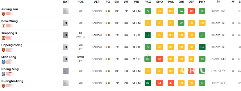 由于武磊处于转会期的缘故,导致最新的排行榜上没有他的名字,但是大部分玩家心目中最强的现役球员就是他了。说完这个题外话,我们来看看目前的排名。其中第一梯队的大部分都是门将球员。门将颜骏凌以73的能力值排名第一,之后就是王大雷71,再是左边后卫李学鹏,后卫张琳芃和门将唐淼。