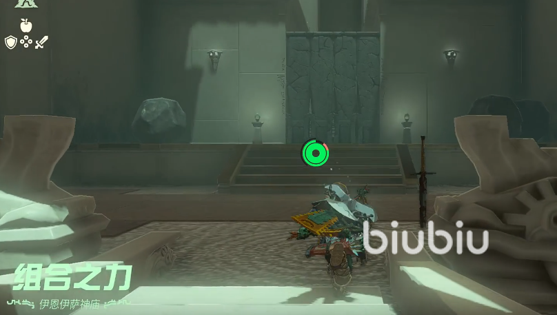 进入神庙,我们会在这里学习使用组合之力。先使用余料建造将门口的大石头和我们手上的武器组合起来,破开门口的石门。然后往右侧跑,敲碎立柱,就会看到宝箱,获得一些木箭。之后往右走,从火焰树上摘下火焰果,将它和箭矢结合,朝着空中宝箱的位置射出一箭。