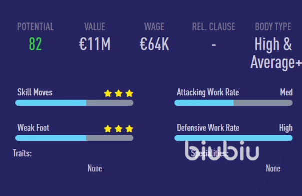 再来看看2000万以下的球员推荐,第一个我们推荐目前在埃因霍恩的特泽。虽然身高不高,但是回追能力非常强。第二个推荐的是效力于皇家社会的苏维尔迪亚。基本上1200万就可以买入,他相比其他球员来说,他的防守非常出色,出球能力比较强,比较适合去破对方的高位,逼抢的,但是速度有点慢。第三我们推荐巴萨的新星埃里克加西亚,潜力有84,能力也不错。
