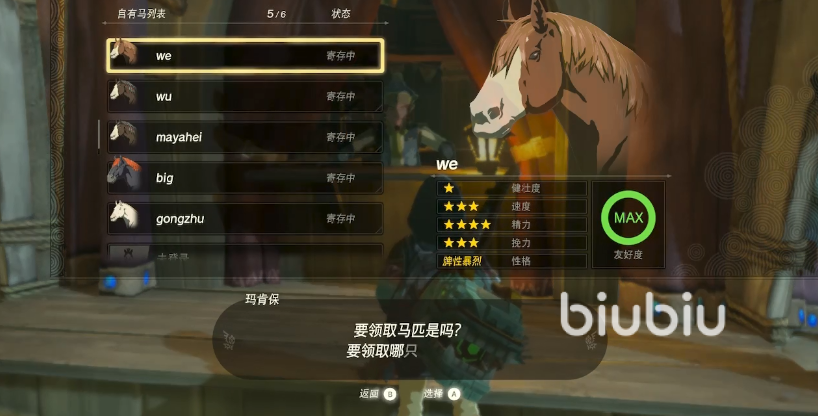 点开之后你可以看到前作你收集的各种马匹,包括它们的名字和属性也详细记录在案,想要骑哪个直接让老板帮你牵出来就行了,然后你就能和它在这个全新的海拉鲁开启冒险了。