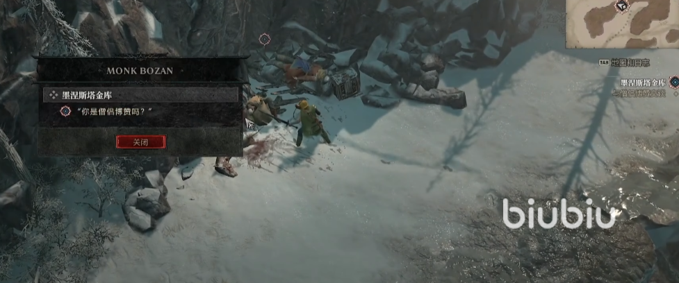 和其他的支线任务一样,我们在接取任务后,就能在地图上看到任务目标所在的范围了,通常使用蓝圈标记。如果大家想要稳定的进行任务,推荐使用biubiu加速器,不仅支持市面上的大多数游戏,就连测试游戏也能享受专属的加速线路。而且新人注册还免费送三天会员。在我们一路被小怪追杀后,顺着一条河流走上去就可以找到博赞了,这里的景象也是十分的凄惨,博赞无力的坐在地上,身边还有死去的马。