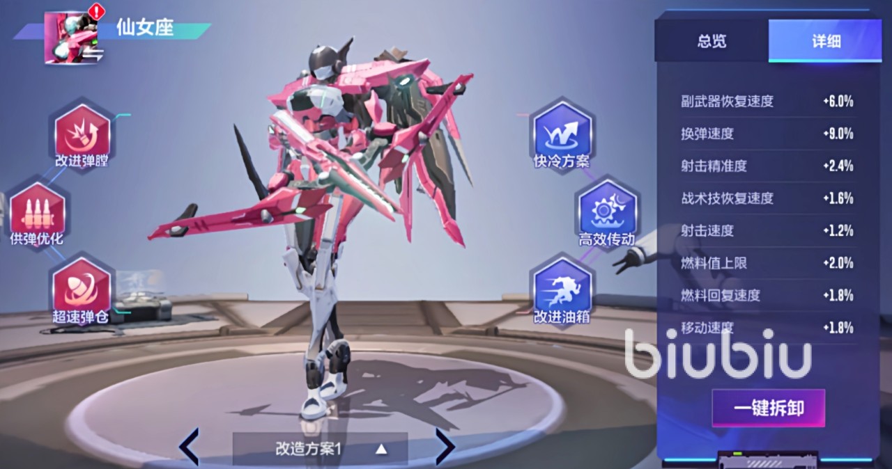 仙女座,是目前游戏当中综合能力最强的,在中距离下,作战能力很强,而且可以短暂的进行浮空,可以快速降低敌人的血量。不过实战中需要注意的是避免跟敌人贴脸战斗,并且需要搭配燃料来提升滞空的时间。这个机甲的技能搭配可以用高能箭槽+快速喷射+强效燃料+热引导枪头,这个搭配也非常适合新手玩家使用,主要是高伤害以及主动的闪避可以用来追击或者躲避敌人的远程导弹,而且燃料多的话可以打也可以撤退。