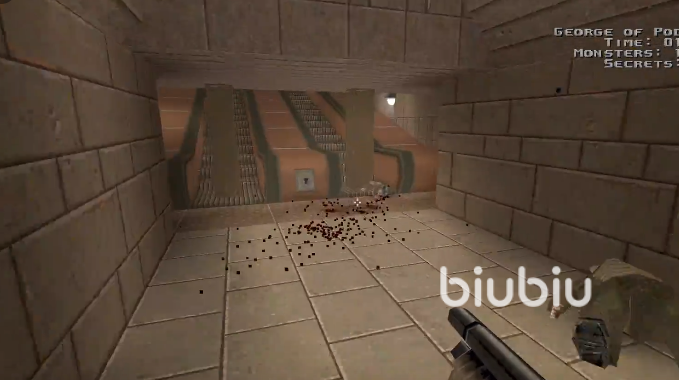 到达电梯处,使用刚刚获得的钥匙,打开左侧的门,然后下来按下开关可以启动电梯。往上走,把石像敲掉,会获得一把电枪。