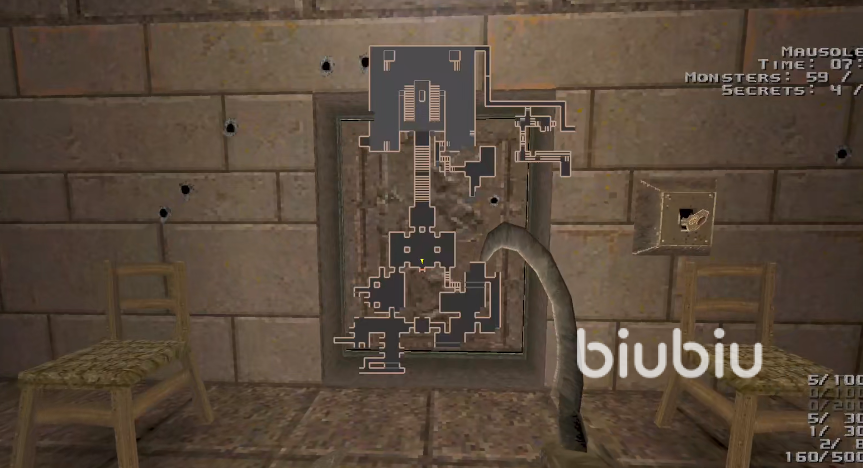 上到上面后左右放入锈钥匙和银钥匙,进入陵墓内库之中,把这些棺椁拆开,每一个都会有25的盔甲。然后往下面走,清理路上的小怪以及拆棺材,这里会获得一个双手手枪。按照游戏内地图显示,往前走就可以。然后我们会获得一把金钥匙,解决上面的两个小怪。打开这个开关,然后赶紧从狭长的通道出来,因为会有一个自爆兵来找我们。