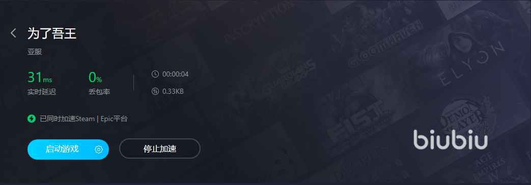 第三,直观呈现加速效果。在加速栏目下,biubiu展示了游戏的加速时间、提速情况、丢包率等。