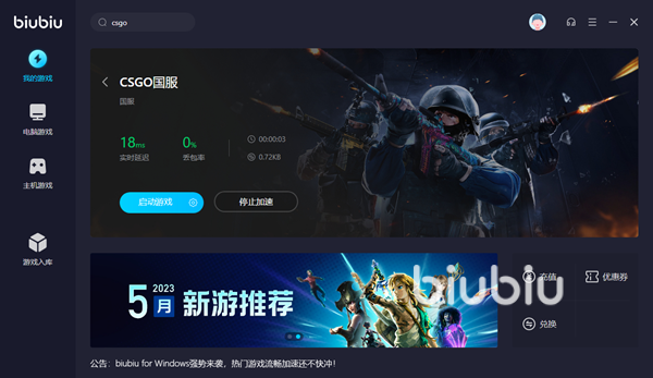 打开biubiu加速器之后需要进行账号的注册和登录,新用户到这里要稍微注意一下,可以领取3天免费试用的特权,全场的游戏免费加速体验,非常良心。进入到软件之后直接在上方输入框中键入csgo搜索,这里可以看到有国服和国际服两个版本。国服能够直接开启加速,国际服需要选择一下具体游玩的哪个服,后续就会根据这个选择来默认加速,不过也可以自己进行切换,还是非常方便的。