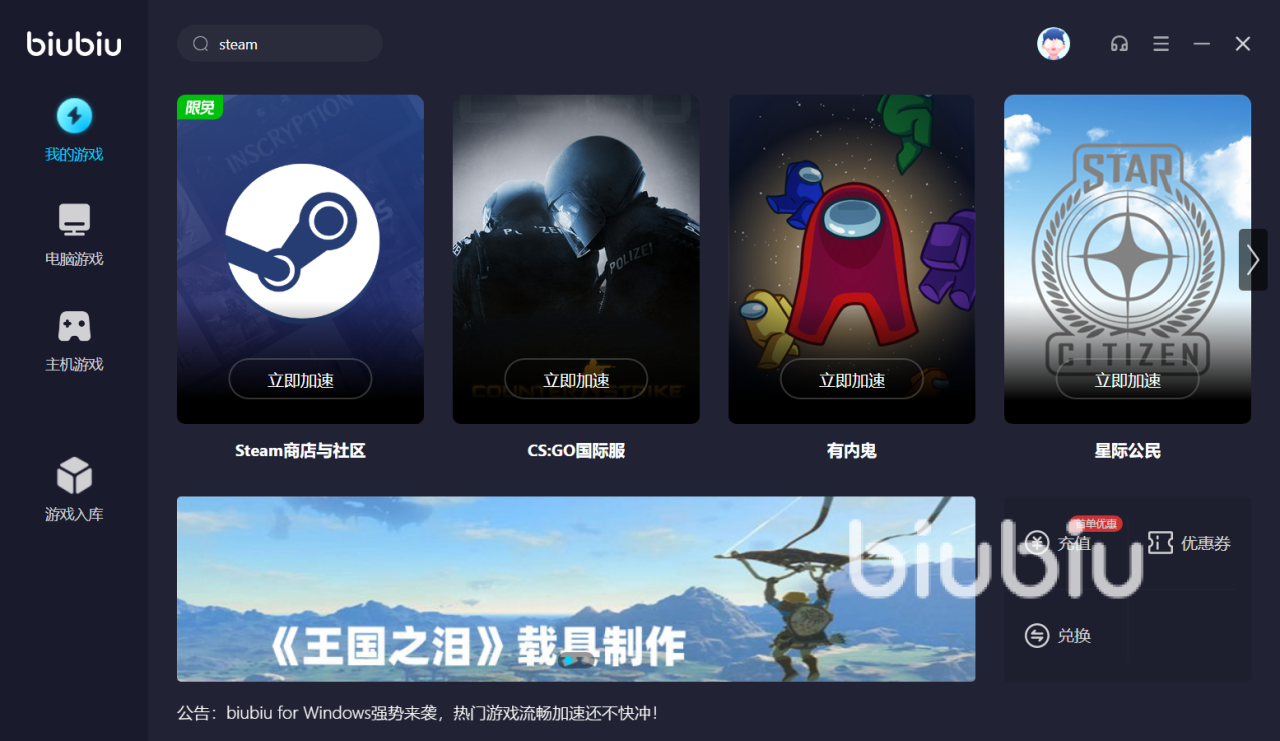 第四步,steam限时免费加速专区。这是biubiu的长期福利活动,steam和暴雪平台游戏实现限时免费加速,新老用户都能体验这一项功能。