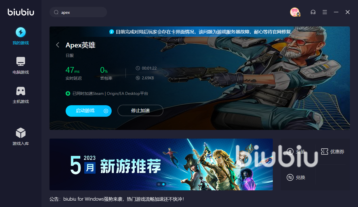 2023年05月19日 10:57 来源:电魂正大蛇丸对于这类热血战斗的游戏,里面拥有浓郁的竞技元素在其中,此外搭载了强劲的3D引擎,让玩家能体验到真实且细腻的射击场景, 各类逼真的武器玩家也是能够去选择的,今天小编就说说apex直接闪退不报错是怎么回事,如果说无缘无故的直接就掉线的话,那么大概率都是网络方面存在延迟或是丢包导致的,而这个时候想要去解决也是非常的简单,大家只需要通过加速器来帮助自己就能轻松的解决。