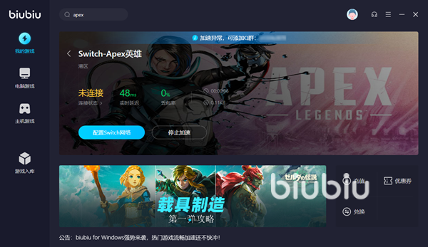 有关apex总是闪退怎么办的问题小编就解答到这里了,这款游戏出现闪退主要还是因为网络故障导致的,所以要对症下药,使用biubiu加速器为游戏进行网络优化,不仅可以避免出现闪退的情况,还能够显著提升游玩过程中的反应速度,而且还支持多个平台版本的游戏,可谓是一举多得哦!感兴趣的话就赶紧下载尝试吧。