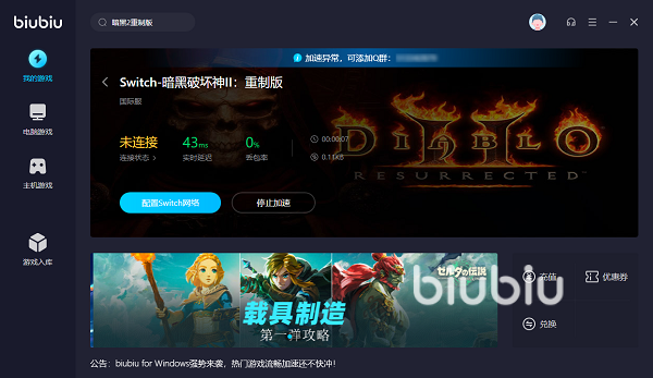 想要使用biubiu加速器,我们先点击上方链接进行下载,安装打开之后搜索相关的关键词就可以找到。目前biubiu这款游戏提供了暗黑二重制版PC端、PS、NS这三个版本的加速服务支持,更是对暗黑3、暗黑4、不朽等系列其他作品提供支援,对于系列粉丝来说是一个好消息,一个加速器就能够搞定。