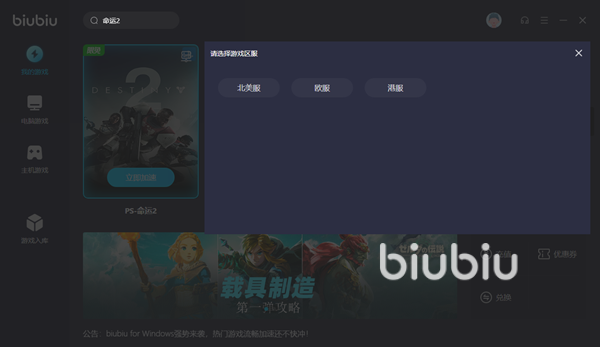 命运2这款作品除了登陆PC之外也在另外两个主机平台上线,很多PC上的加速器产品仅仅针对电脑版推出了优化服务支持,这让很多多平台的玩家不得不额外购置加速外设或者是开通其他的加速产品。而biubiu就将这几个平台集合在一起,一份会员加速多个平台,让大家省钱又省力。在biubiu软件中搜索命运2游戏的名称大家就可以看到目前支持的平台版本并且将自己正在玩、准备加速的版本添加到功能列表中。