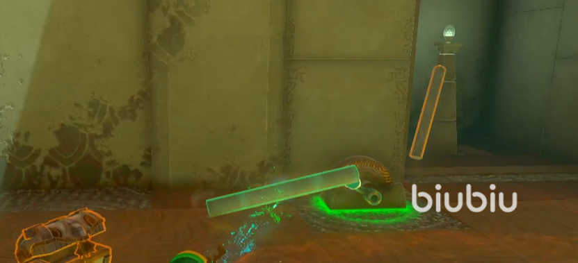 进门后我们先看看这里的结构,地上有一个木棍,木棍的左边有一条悬空的石板,右边的墙上则有一个石磨一样的机关,再往里可以看到高处有一个宝箱。首先我们用究极手将木棍和高处的宝箱粘连在一起,拿下来打开,再将木棍和旁边的机关粘连在一起,掰动打开旁边的门,可以发现门里还有一根木棍,将其拿出。