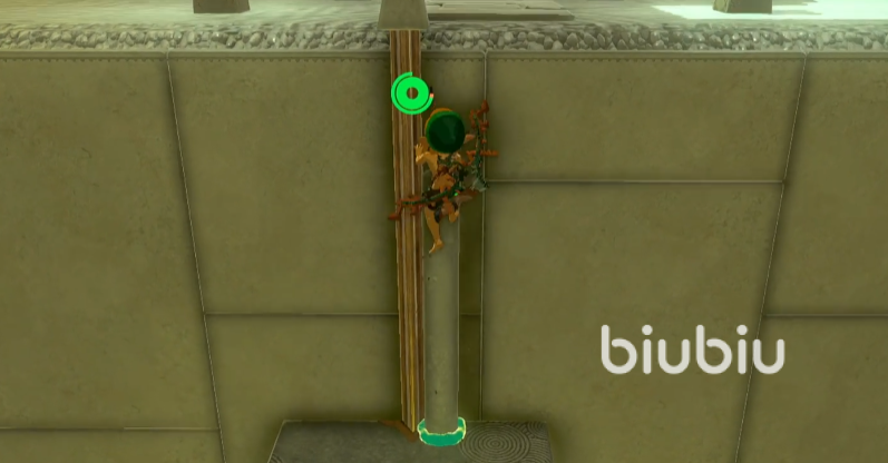 放到大门左边的石板上,使用通天术飞到石板上方,我们会发现上面还有一个石墩。先将木棍移到石墩上,继续使用通天术飞上去,在这里我们可以看到:距离神庙的出口还是有一段距离,这里需要将木棍竖起来靠在墙上,只要爬上木棍,就可以跳到顶端的平台了。