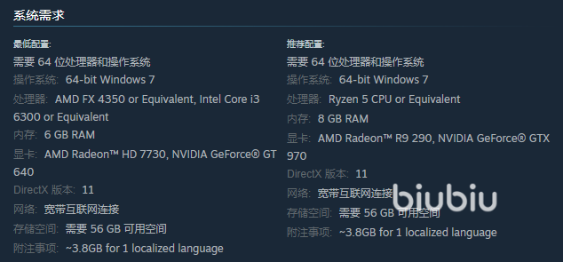 大家最关心的无非就是CPU、显卡和内存,我们先从CPU说起,游戏要求因特尔I3 6300处理器,显卡则是GT 640 ,已经是很多年前的老卡了,相信大多数的玩家现在使用的设备至少在1060和I5处理器以上,所以这两个要求想必大家都能满足。内存则最少需要6GB,现在市面上除了少数笔记本,内存最少也是8G,大家看到这里是不是可以理解之前小编说的,是台电脑就能玩了。