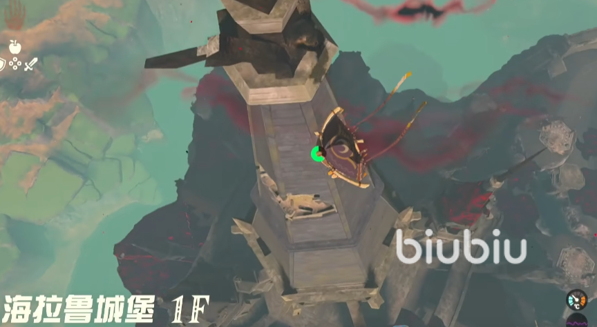 直接走进鸟望台的电梯,我们在到达顶端后,使用它飞到天空上,然后朝着海拉鲁城堡的方向飞。在天上我们可以看到,精力条是在慢慢消耗的,而监视堡垒离目的地又是非常远的,所以在途中我们可以吃提前准备好的精力料理,大概使用2-3个,就可以飞到海拉鲁城堡的上空了。