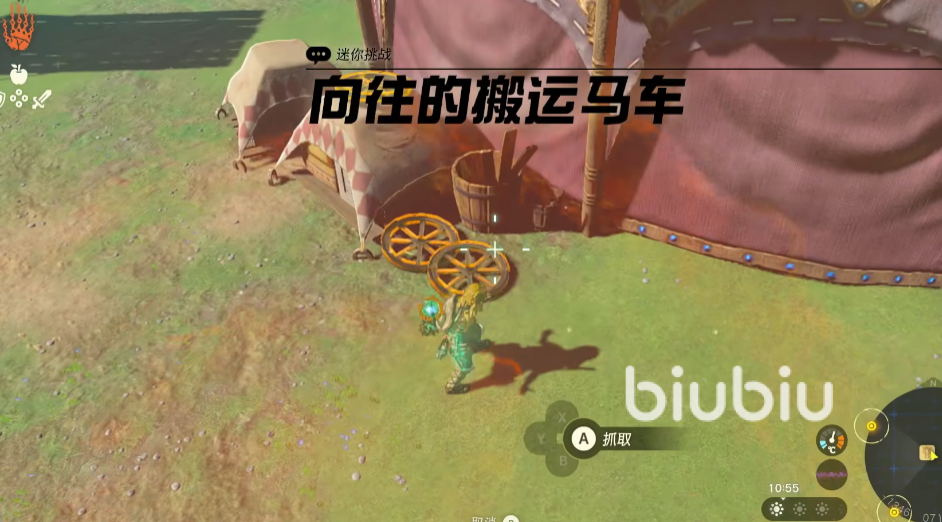 我们可以在监视堡垒的西面,找到新玛丽塔驿站这个地方,来到NPC可姿米处就可以接取任务:向往的搬运马车了,完成这个任务会获得100卢比。这个任务完成要满足两个条件,抓一匹马和安装车轮,车轮就在旁边,我们可以直接使用究极手装配上去,马匹也可以在附近轻松地找到,尽量找花色复杂的马,比较容易驯服,骑着马回去找到NPC,我们就可以完成任务了。这样我们再回到监视堡垒,就可以购买斗篷了。