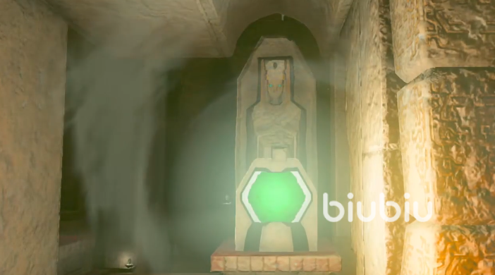 当跑出来之后,我们直接触发机关,有一个女神雕像,会移动到墙里面。此时,这束光会找到对面墙壁上的女神像,触发机关,雕像会向后撤,露出藏在下方的机关。踩下这个机关,雕像同样会隐匿到墙里面,后面的道路就会显露出来。4楼这里有一个锁,用石块,挡住前面的陷阱,进去后发现又有一个雕像,左边有一个开关踩上去,左边会出现一个新的陷阱。使用林克的究极手,将陷阱抵挡上。这里需要注意一点,就是将石块侧着放,这样可以让光线从中间通过。