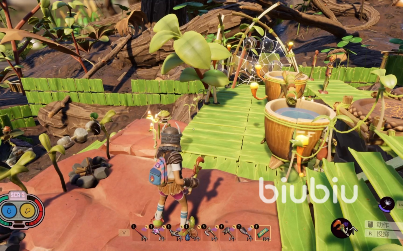 进去实验室后会发现有几个小机器人,在这里可以把它们消灭掉再拿物资,然后一直往里走,在最里面的一个房间可以解锁资源检测器。接着出了实验室继续往滑索的另一面走,往蜘蛛网的方向走会有一处有三个蜘蛛蛋,这里往左拐继续向前走,会发现一个实验室,可以获取点物资。出实验室的门后向右边继续前进,中间从蘑菇上绕过去,再通过滑索滑到另一边。之后在一个红色的大平台处往右边树枝走,在从前方的房子里面获取物资后,再向左走会发现路边有一个很大的绿色树叶,这里需要跳上树叶,通过树叶往左边走会发现前方有个滑索。
