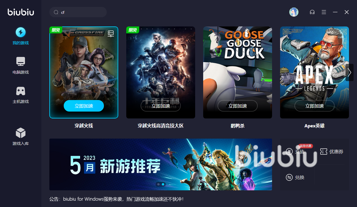 Cf的小伙伴们在biubiu平台上去使用biubiu给cf游戏进行加速的过程也是很简单的,流程过一遍就可以学会。在cf的玩家们下载好biubiu之后,只需在biubiu平台内搜索cf游戏,然后点击选项添加到自己的游戏主页中就可以了,之后只要想要玩cf游戏,就可以直接在biubiu游戏中启动。
