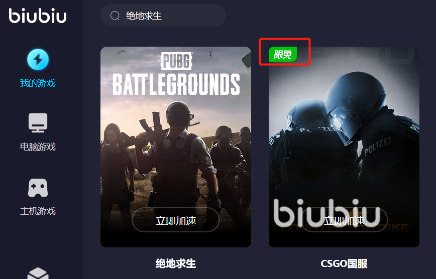 其次,不知道大家有没有注意到在biubiu加速器平台内,出了游戏加速外,还有着相当大的游戏库,这主要服务玩家们对于不同游戏的使用要求,因为游戏肯定不会就玩一款的,加速器也要变通。大家平常游戏玩腻了不妨看看有什么新游戏,加速体验一下,说不定有新的游戏乐趣呢?不单单是大家熟知的国服游戏,还有主机游戏等,一般游戏左上角写着限免字样的那么就可以免费使用,这对于学生党来说那是相当不错的,记得要体验一下哦。
