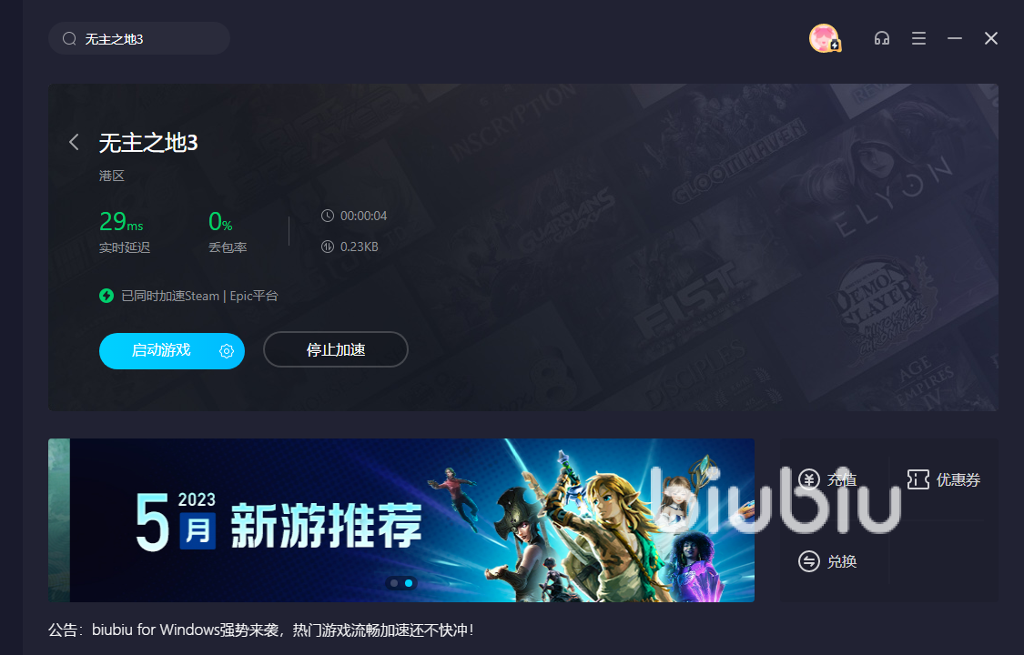 此外加速器针对新用户现在是有三天免费试用机会的,也就是说不需要上来就充值,这一点是非常人性化的,考虑到玩家对于加速器功能和效果不了解,所以如此长的试用时间,也是能让玩家对其有个更全面的认知,觉得不错以后在考虑充值与否的问题,并且针对steam以及暴雪平台的部分游戏,也是有着限免的福利,大家进入游戏库中就能够了解到。