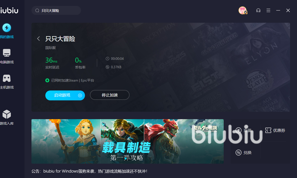 Biubiu除了能够维护只只大冒险的游戏以外,让小伙伴们上手也是很快的。Biubiu的操作只有简单的三步:1.在软件商店上下载biubiu;2.在biubiu上搜索添加只只大冒险;3.在biubiu上启动只只大冒险游戏。就这么简单的三步步骤,小伙伴们就可以享受biubiu带来的福利。让自己不需要花费什么成本也可以使用这么好的加速器。