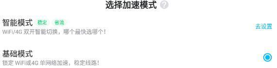完成了上面两步后,大家可以根据自己设备所处的网络状况,选择合适的加速模式,就可以了。如果是在移动网络下,大家可以选择智能模式,在该状态下,如果连入了WiFi,系统会自动切换,避免游戏掉线。如果在无线网中,选基础模式就够用了。