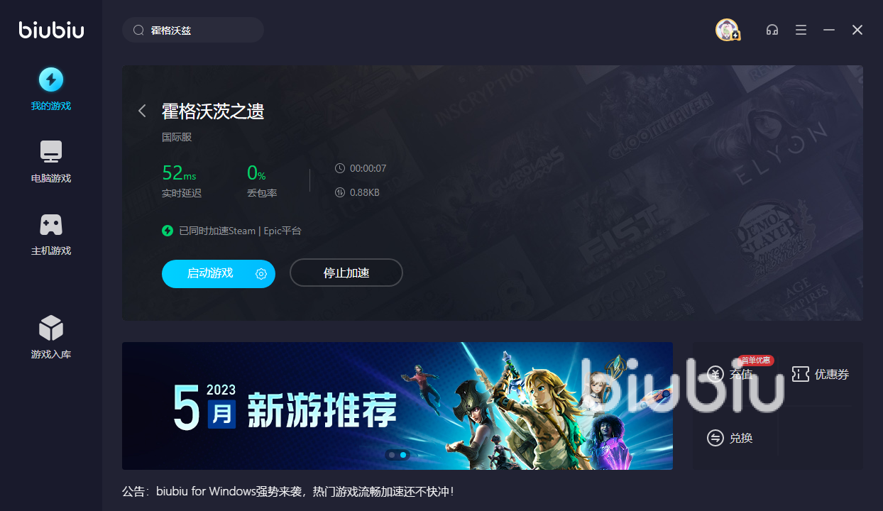 霍格沃兹推出上线的时间并不长,市面上许多自称“大型”的加速器内都还没更新出这款游戏来,而biubiu加速器同步新游戏的速度特别快,通常游戏刚上线不出三天的时间内这里就能提供加速,且新上线游戏biubiu加速器也会在初期开启一段时间的限免加速,不过游戏是否参与活动要注意是否带有“限免”的标志,要是想知道游戏是否支持加速的话,可通过在搜索框里输入名称来进行模糊数据搜索,只要是相关的游戏都会推荐出来。