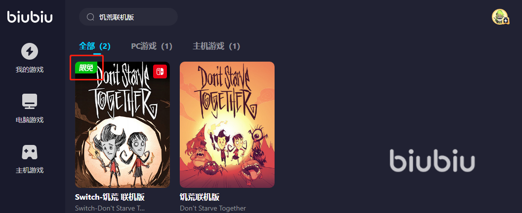 了解饥荒联机版的同学也知道它不仅仅只是在PC端有登录,还有部分同学可能还会在线下聚会时一起用Switch去玩,值得关注的是现在biubiu在面向Switch游戏时能免费加速,这种加速是无门槛设定,就算是没开会员也能免费去用,不过它也是作为限时活动在一定时间内去回馈新老用户,从侧面也能看出biubiu可搜索到同名游戏下的各个支持平台,能搜索的到就代表支持加速。