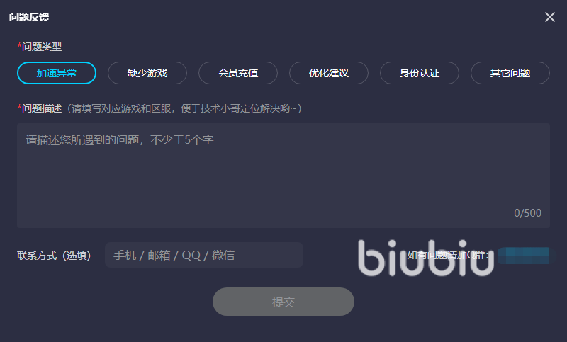许多小白同学在初次使用biubiu时可能也会有一些疑问,比如加速效果不好或是想玩的游戏找不到等等,在面对这种情况时也不要着急,虽然是作为加速器平台,但这里也还有专业的客服顾问帮你解决一系列问题,想要找到平台的话点击右上角的问题反馈标志即可,随后也可选择是否留下自己的联系方式,后续都会有人去对您提出的问题来进行跟进反馈。