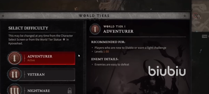 然后随着人物等级提高,装备越来越好,到60级左右可以再去挑战一次进阶副本,可以解锁更高一级的难度。为了顺畅的进行游戏,也是需要使用加速器的,比如小编最近在用的biubiu加速器,就可以为暗黑4专线加速。能有效防止网络掉线的可能,而且新人注册还免费送三天会员加速。