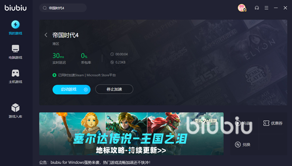 这款工具很多小伙伴都不陌生,相信大家身边也有朋友在使用吧。这款加速器支持的游戏作品非常多,点击上方按钮免费下载安装之后可以看到左侧将游戏作品分为了电脑游戏以及主机游戏两大板块。我们在电脑游戏库中通过寻找就能够看到帝国时代4这款作品,或者灵活运用搜索框则更加方便,能够快速定位。