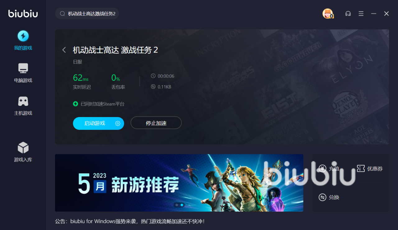 看完小编对于该软件的介绍之后,现在大家知道机动战士高达激战任务2加速器哪个好了吧,biubiu作为端游和主机游戏等领域都很好用的加速软件,支持目前市场上绝大多数正在运行的游戏,只要有加速需求就可以在这里实现。
