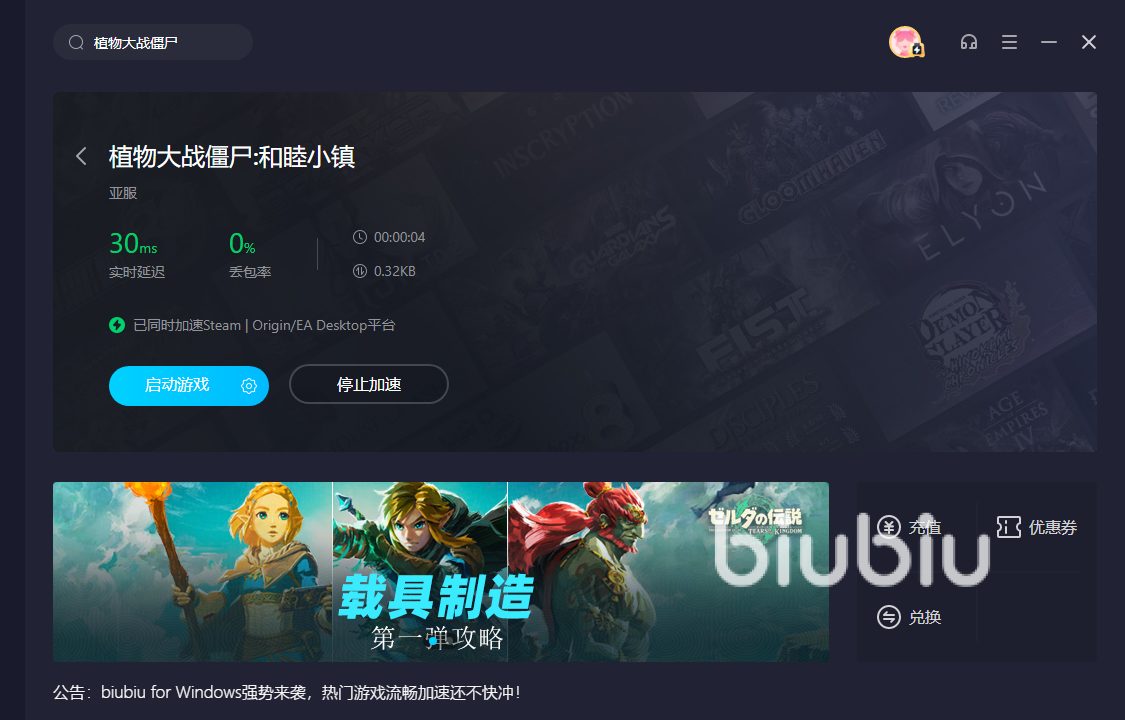 首先,它拥有全球覆盖的服务器网络,在玩这款游戏的时候需要把各种各样的数据回传给服务器,然后另一端会再给我们这边一个显示指令,虽然说起来简单,但是中途会遇到很多问题,使用biubiu加速器就会非常简便。你只需要下载并安装biubiu加速器软件,打开软件后选择植物大战僵尸:和睦小镇作为你要加速的游戏,biubiu加速器会自动为你优化网络连接,让你畅快游戏。