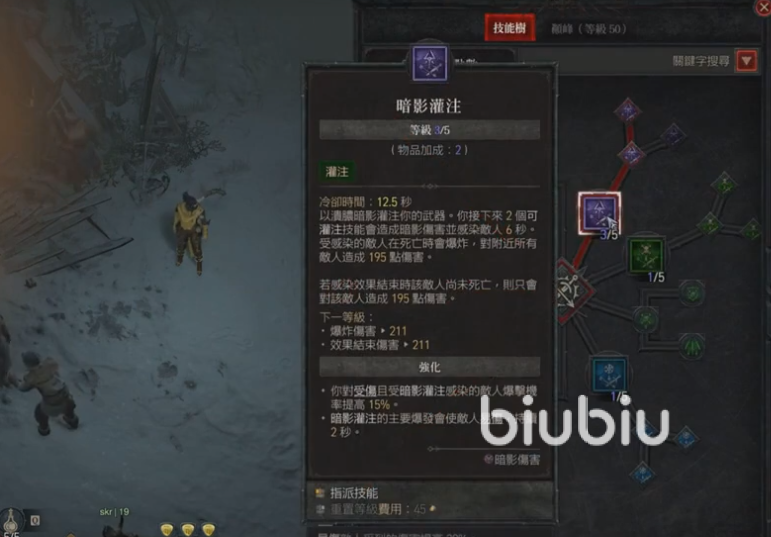 我们在找装备的时候最好找传奇装备,因为传奇装备有个威能,可以将之萃取出来并进行刻印,这个职业只能通过核心技能打伤害,其他的技能都是辅助,所以核心技能加上传奇威能是最主要的伤害来源,技能类的威能都是增强AOE伤害的。这一部分建议小伙伴们不要近战和远程技能混搭,这样操作体验起来并不是特别流畅。我们需要寻找灌注技能类的传奇威能,比如暗影灌注,这个威能能够增加AOE伤害并且增加一个易伤的效果。灌注的效果其实就是为核心技能增加伤害或者是赋予一些新的机制,所以目前核心技能加上灌注技能组成了这个职业玩法的最主要的一个部分。