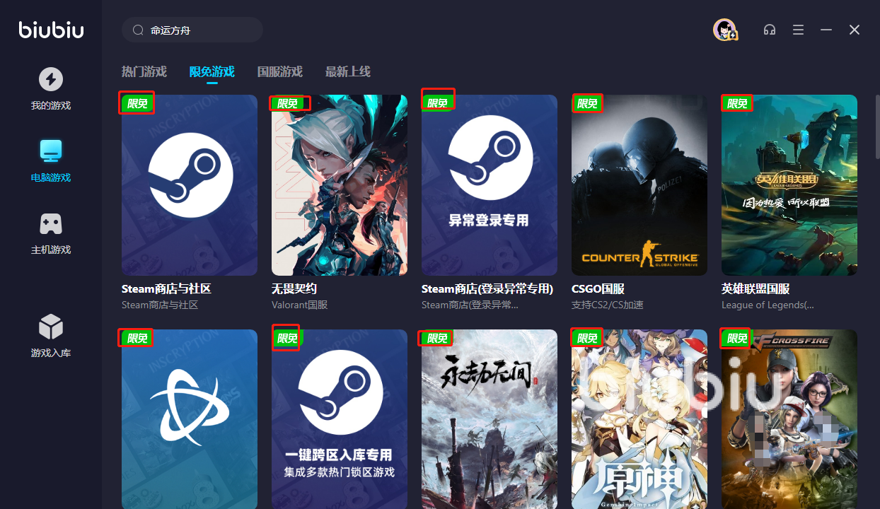 有些同学在看到“限免”的标志后就激发了兴趣,还想知道目前在biubiu中还有哪些游戏能限时免费加速,想要寻找的话就在“电脑游戏”的“限免游戏”中去看一看,出现在这里的不管是平台还是游戏均可完成加速,不过这里面的游戏不能确保是覆盖了所有的国内游戏,只能说是大部分的游戏都有,要是有自己想玩的国服游戏却找不到的,可以点击反馈下方的“告诉biu仔”让系统在下次更新时考虑添加游戏。
