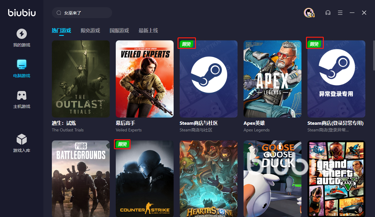 在了解加速器的功能如此强大之后,玩家们也会习惯性地再去找更多的游戏玩,而锁定的目标通常就放在人气较高的游戏以及刚刚上线没多久的游戏,但却又担心新上线游戏没有加速服务,而这个问题在“电脑游戏”分区内就能看到,这里都是根据数据统计出来的新游戏和热门游戏,只要是有的话就代表同样也能加速,同时还能注意到下方的“主机游戏”中都是限免活动中。