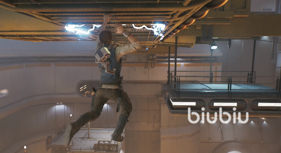 到达5E地区,继续前进,爬上右边的墙壁,同样会有电流,注意躲避,然后爬到上层平台,通过多段翻滚,跳跃,攀爬,我们会来到组装棚架。
