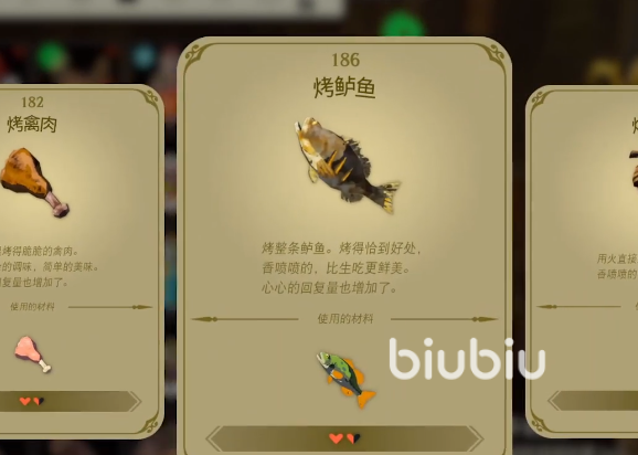 提到烹饪,这里就简单介绍下用生命鲈鱼作为材料的两种料理吧。一个是基础的烤生命鲈鱼,可以回复一格半的血量,另一个是冰冻生命鲈鱼,可以回复血量的同时,增加耐热度。玩家们也可以自己根据脑洞,创造出各种食谱的。