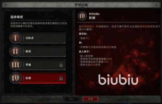 刷BOSS无疑是获取它们的最好方式,但想要更高的掉落几率你最好更改一下难度也就是世界等级,但这并不会像其它游戏一样强制进行对你进行同步,随着等级的提高你可以在主界面进行解锁和选取,最高为层级4也就是折磨难度推荐为70级,该模式下敌人会无视40%的抗性,此时玩家会显得更脆弱,如果你没有一定练度话可以暂时不用挑战。