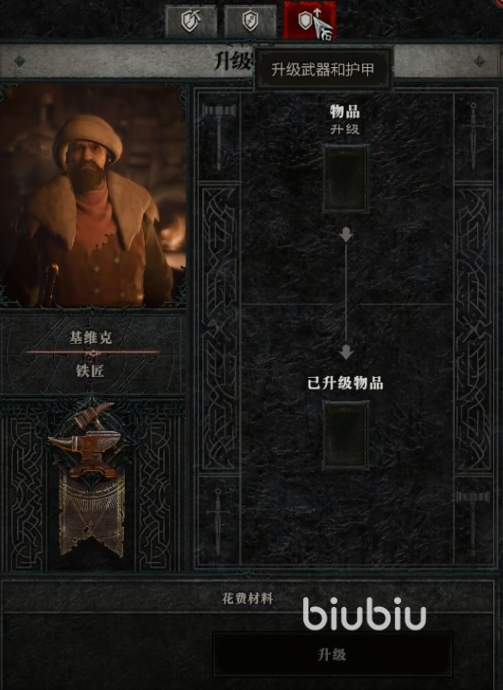 进入游戏后我们先找到位于主城的铁匠,虽然每个地区的铁匠不同,但他们的工作都是一样的,打开选单找到第三个有一个盾牌加向上箭头的标识就是了。玩家只要把自己的防具或者武器放上去就可以进行升级,但是需要一定的金币和材料,具体要准备什么以及多少钱会根据你需要升的物品发生变化。