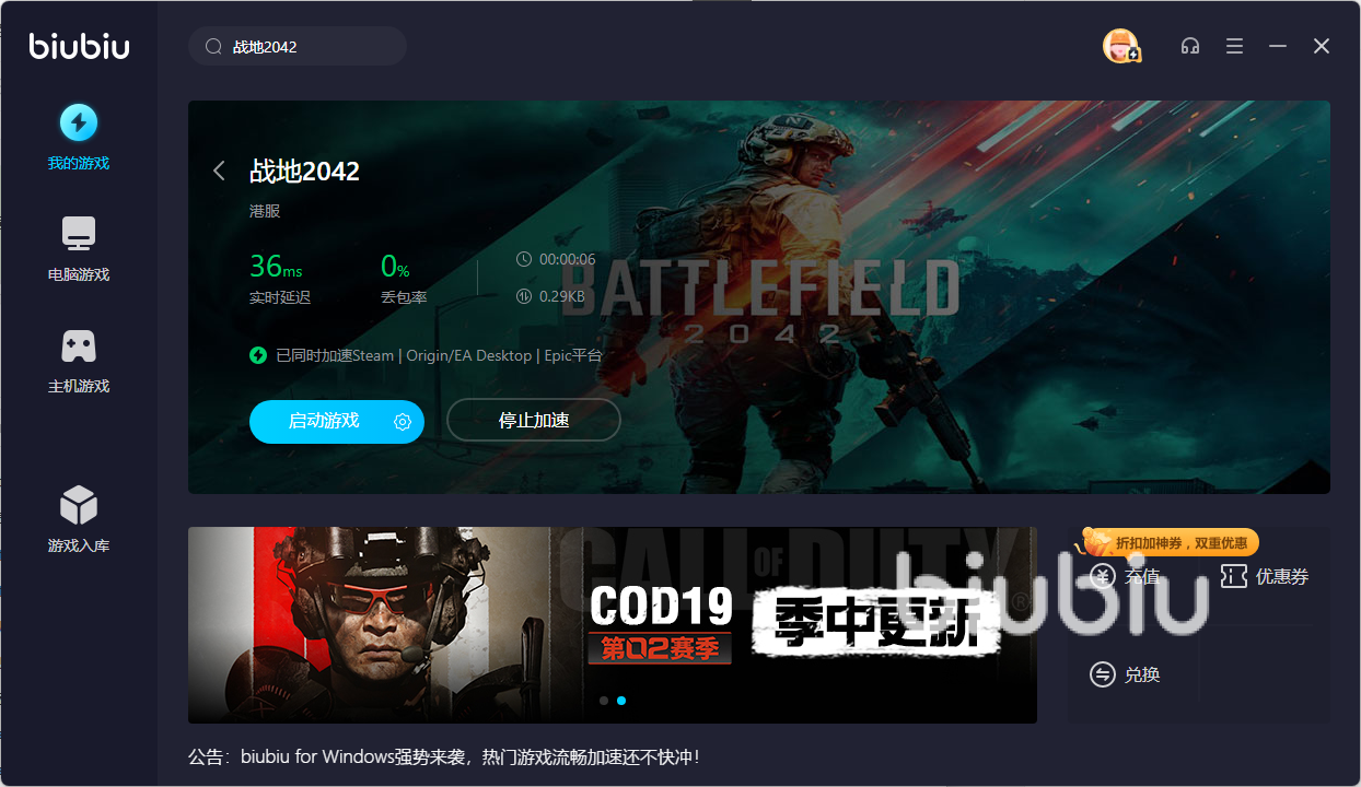 所以大家如果现在玩战地风云2042时还会遇到游戏进不去的情况的话使用biubiu加速器就可以很快解决了。如果各位小伙伴们之前并没有使用过biubiu加速器的话,现在下载注册使用还可以获得3天的免费加速时长哦。