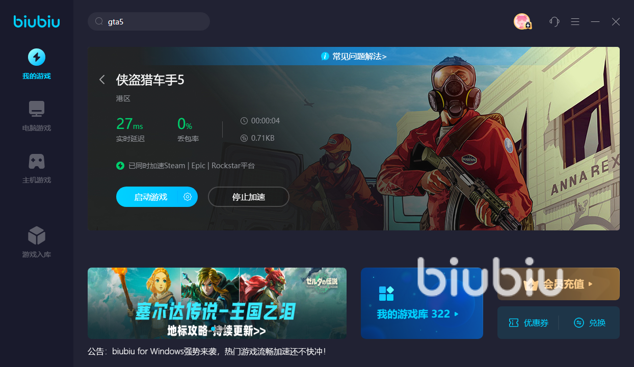 当然,最引人关注的莫过于这款加速器最新推出的游戏社区系统,在社区中,有无数游戏的攻略可以供大家翻阅,而gta5作为一款自由度很高的游戏,当然也包含在内啦!小编自从加入了社区,在不断的查看攻略后,也迅速成为了一个gta5的进阶玩家,可以说是完美的度过了新手的期!同时,还有着许多3A级游戏大作的第一手讯息,各位玩家们可以在第一时间接收到他们,而biubiu也会在他们上线的第一时间进行收录,并提供加速服务,实在是方便无比。